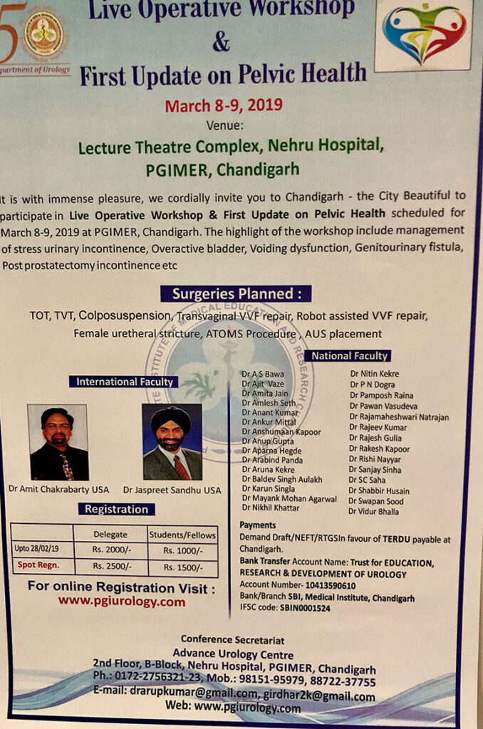 Invited Faculty at the Live Operative Workshop and First Update on Pelvic Health, PGIMER Chandigarh – March 8th – 9th, 2019